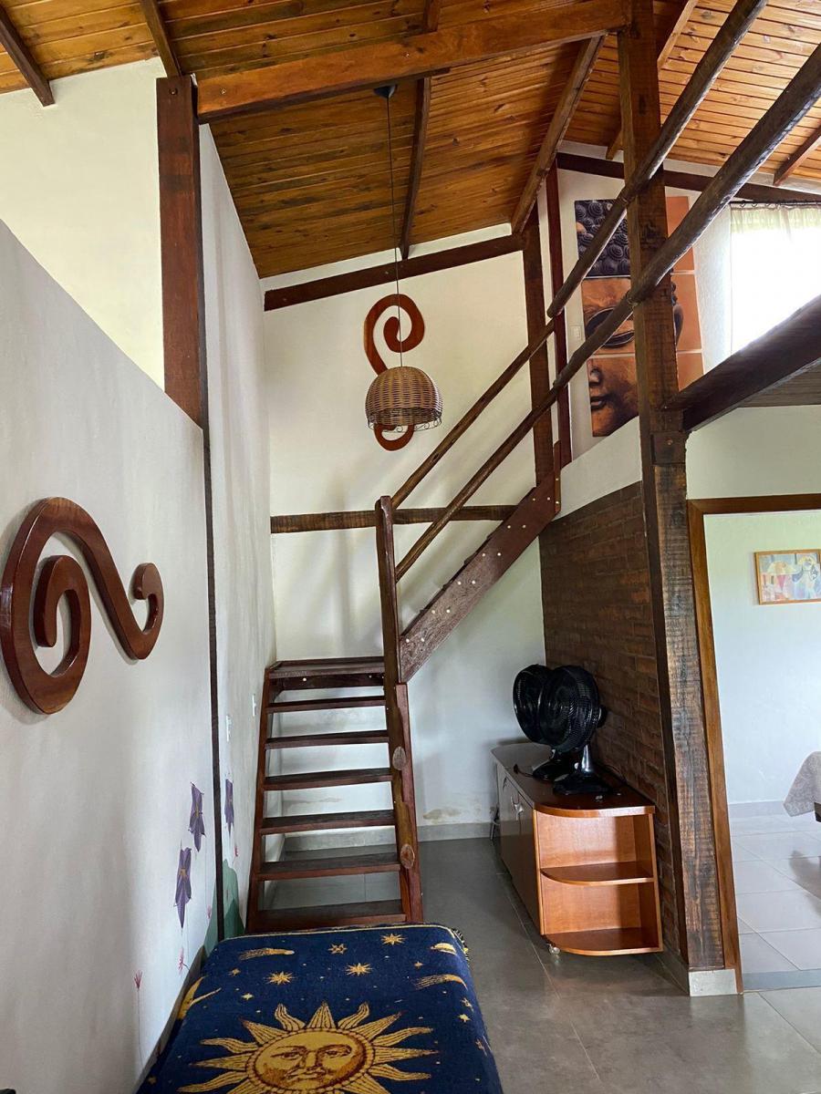 Hall com escada de madeira que conecta aos quartos e ao mezanino.