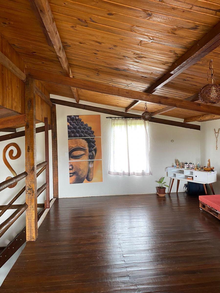 Mezanino sobre os quartos, com acesso a um deck com vista para o jardim.