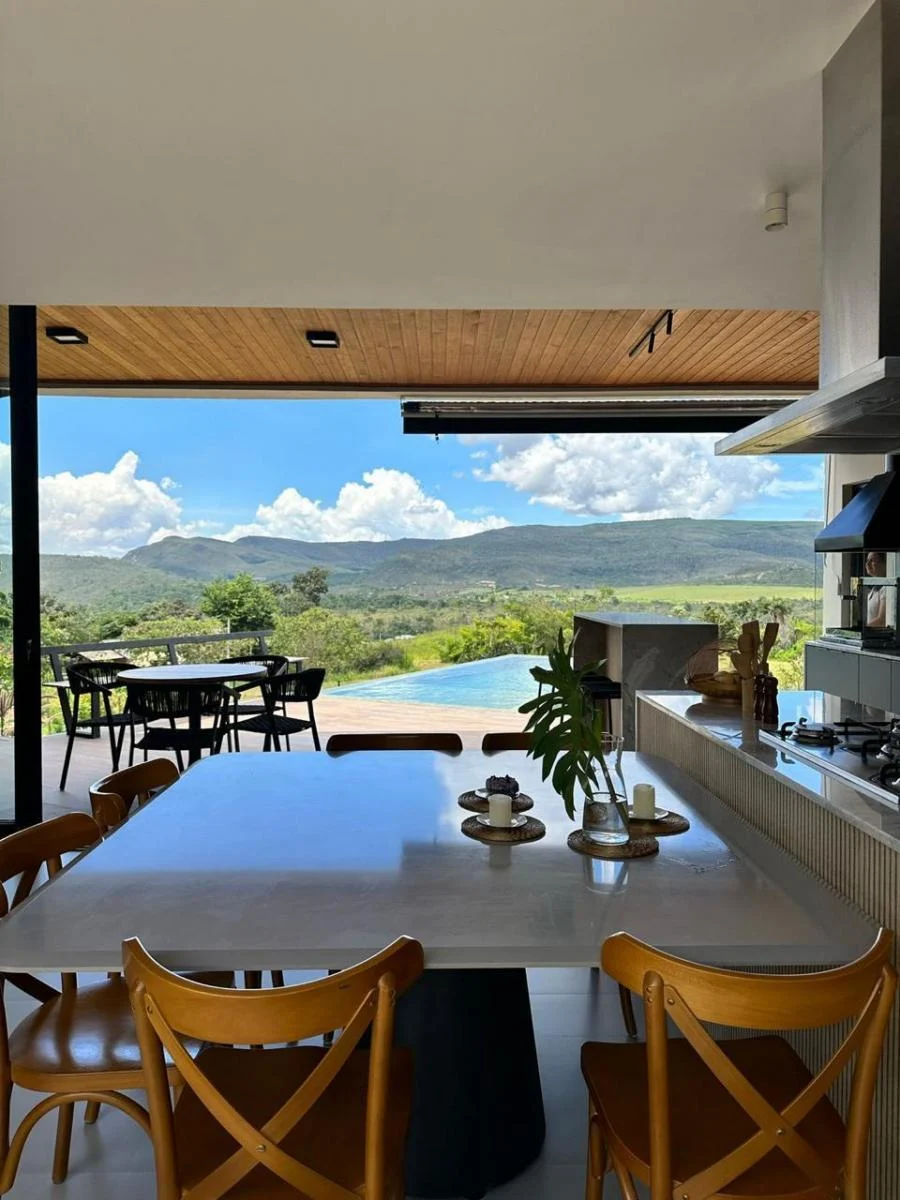 com 3 quartos, sendo 1 suíte com banheira a closet e dois dormitórios com banheiro reversível, piscina aquecida com borda infinita, deck e ducha na área externa, varanda em todo o limite da casa, cozinha conjugada com sala, escritório, lavanderia, lavabo, duas vagas, Irrigação no jardim e quintal. Construída em condomínio residencial regularizado, com ambiente tranquilo junto a natureza, onde se avista diariamente revoadas de araras, tucanos e inúmeras espécies de pássaros. Fornecimento de água alcalina de poço artesiano e rede de energia elétrica subterrânea com iluminação apropriada para contemplação da via láctea. Documentação com matrícula individual e IPTU.