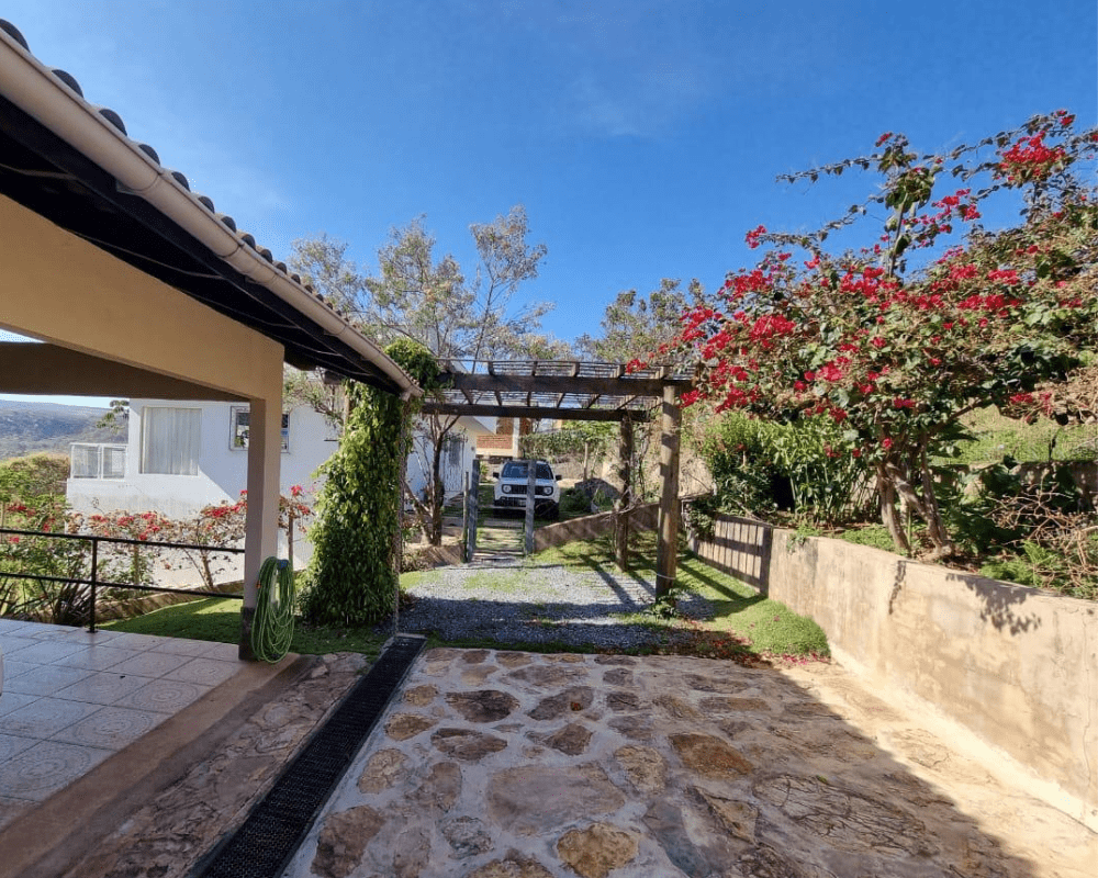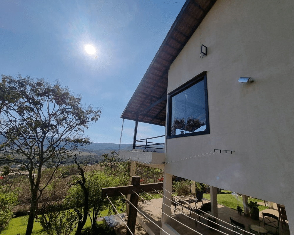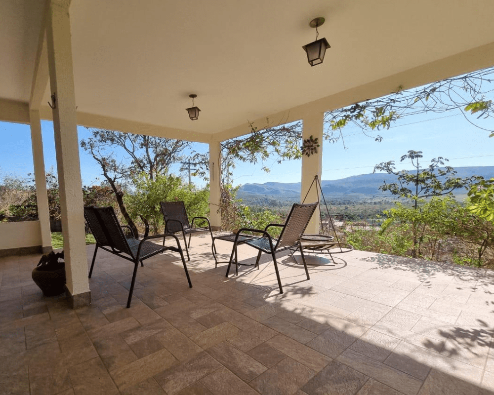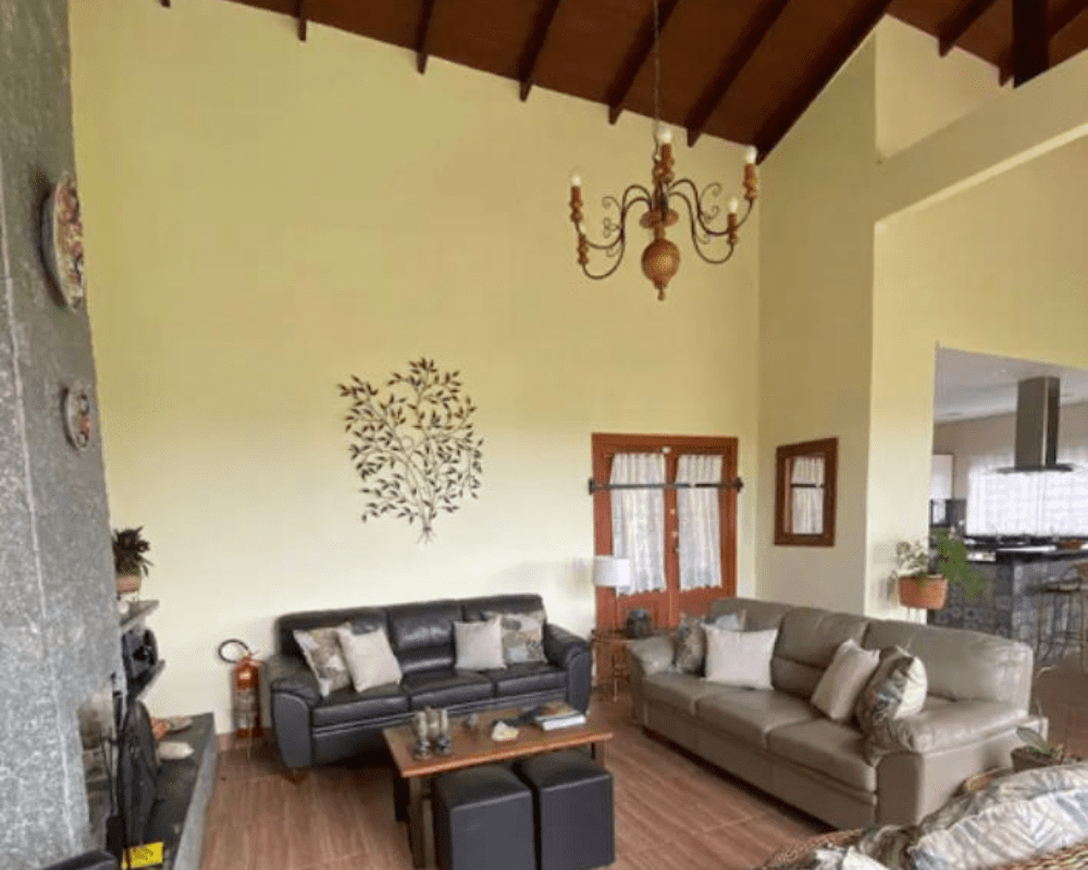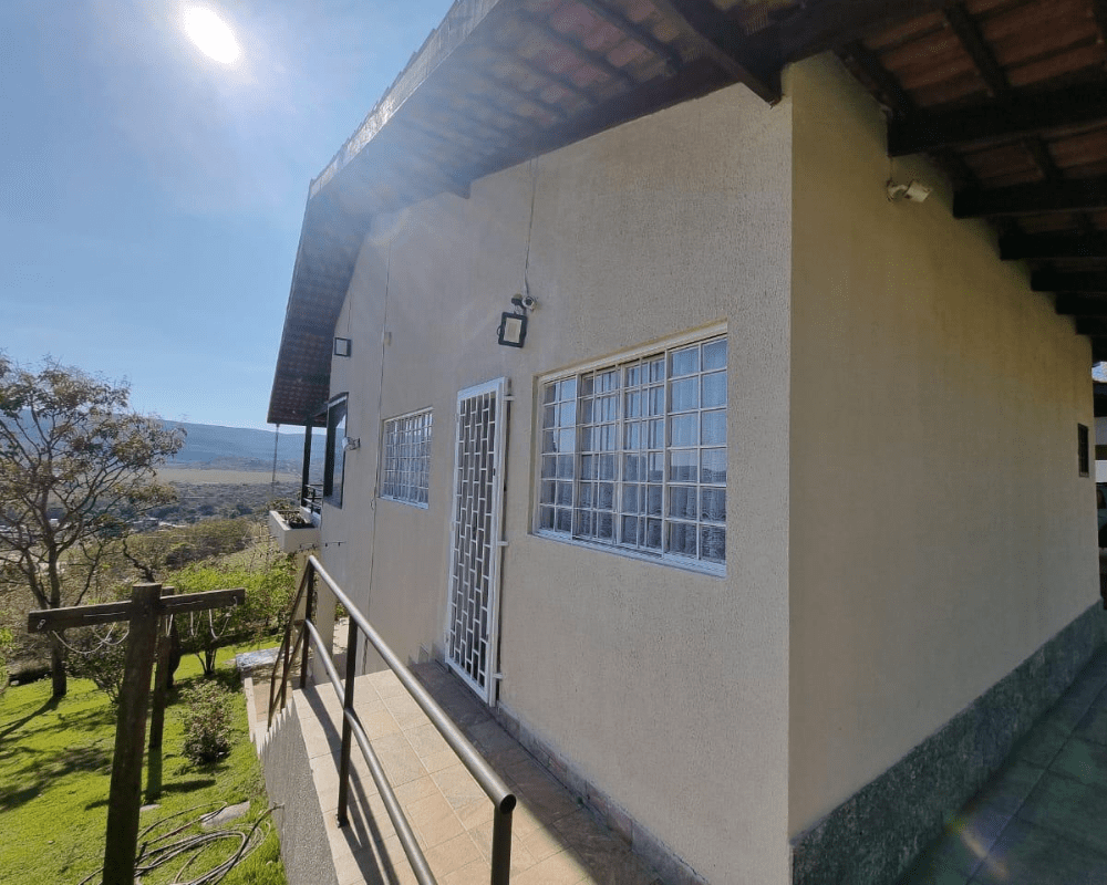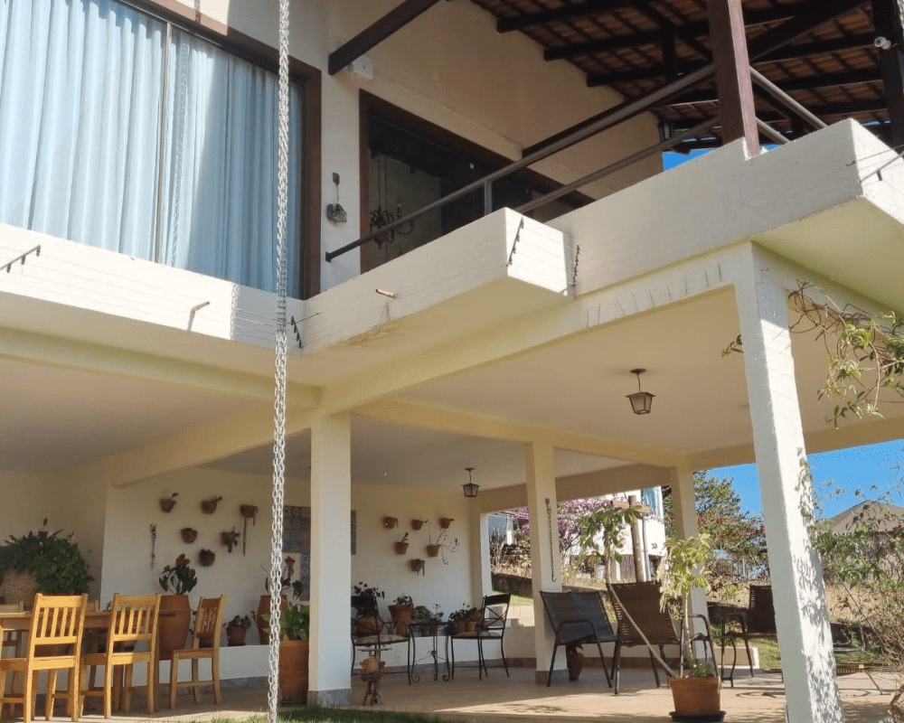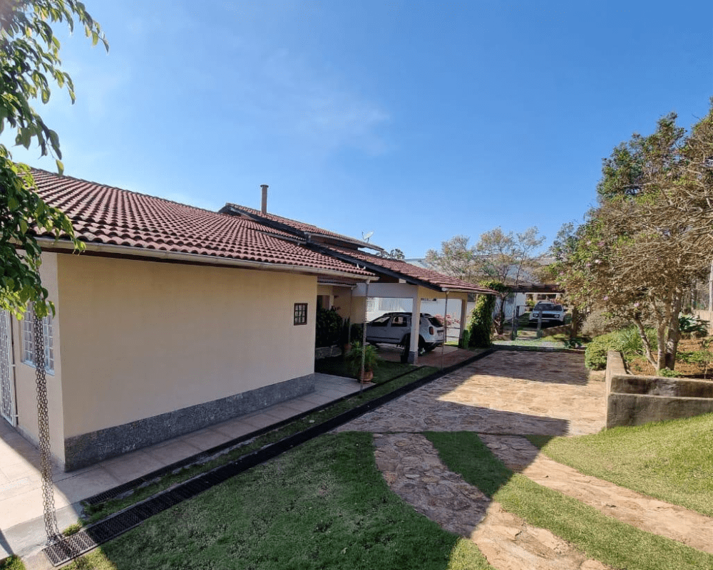 São 400m² de construção em alvenaria em ótimo estado de conservação e fino acabamento, projetada pela renomada arquiteta Edna Leone, com vista permanente para o vale e serras construída em terreno de 1.100m² com suave relevo que recebe todos os dias revoadas de araras, tucanos e pássaros. Sala de estar com pé direito alto, lareira e parede revestidos em pedra. Escritório com duas estações de trabalho. Varandas em 3 suítes, no escritório e sala jantar. Sala de jantar, 4 amplas suítes com duchas de aquecimento solar. Cozinha completa, varanda, suítes e salas para nascente. Garagem coberta para 2 carros, Dois depósitos. Banheiro e ducha para área de repouso, área de serviço, dependência completa e aquecimento central. Sistema de segurança com câmeras integradas na Internet. Toda mobiliada com jardim, cercada em tela em condomínio com escritura coletiva e registro de matrícula.