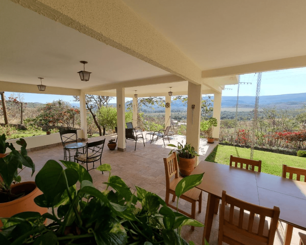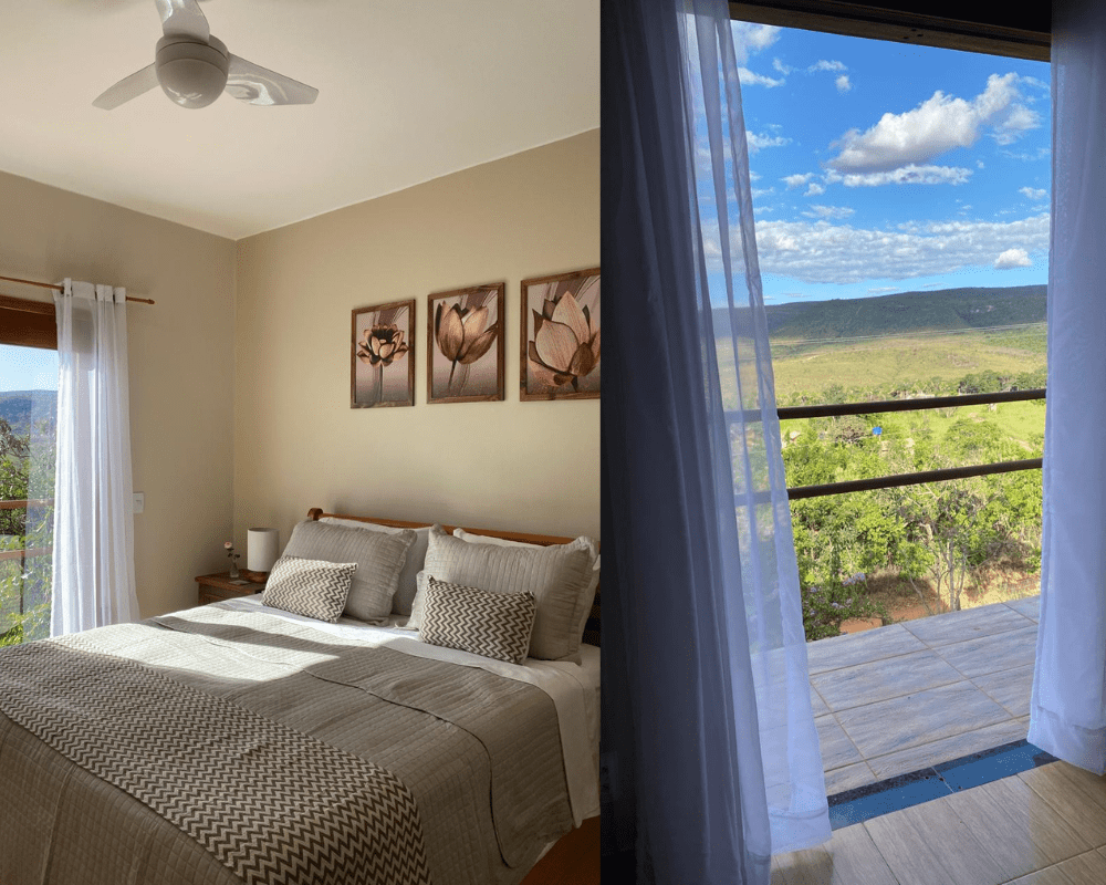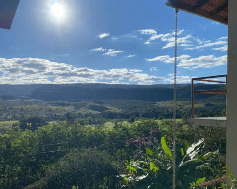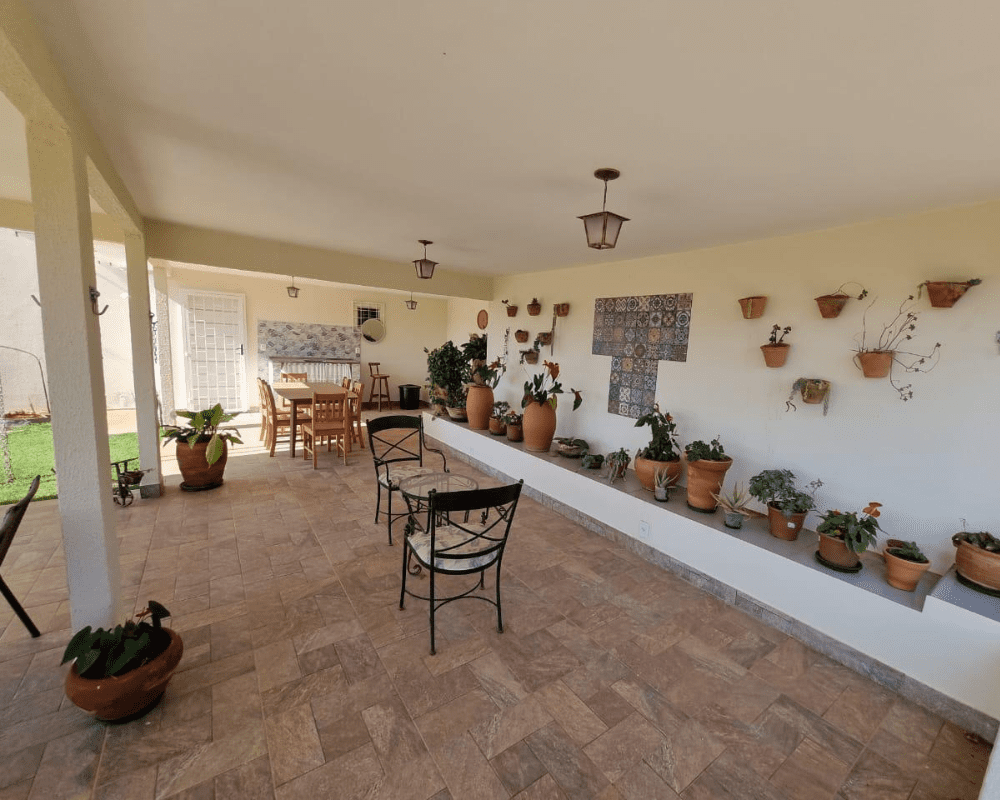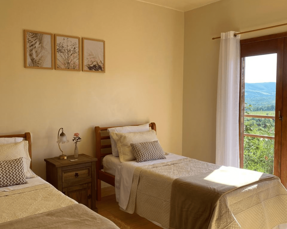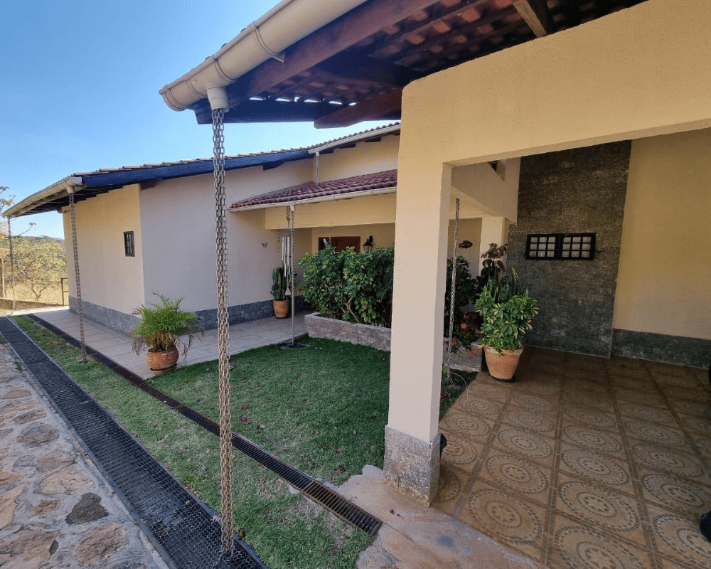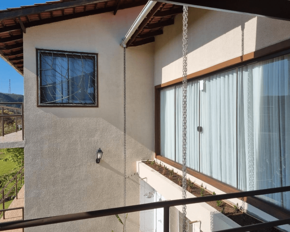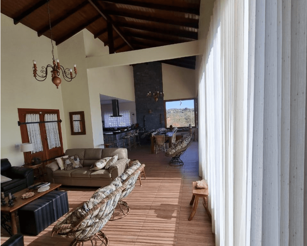 São 400m² de construção em alvenaria em ótimo estado de conservação e fino acabamento, projetada pela renomada arquiteta Edna Leone, com vista permanente para o vale e serras construída em terreno de 1.100m² com suave relevo que recebe todos os dias revoadas de araras, tucanos e pássaros. Sala de estar com pé direito alto, lareira e parede revestidos em pedra. Escritório com duas estações de trabalho. Varandas em 3 suítes, no escritório e sala jantar. Sala de jantar, 4 amplas suítes com duchas de aquecimento solar. Cozinha completa, varanda, suítes e salas para nascente. Garagem coberta para 2 carros, Dois depósitos. Banheiro e ducha para área de repouso, área de serviço, dependência completa e aquecimento central. Sistema de segurança com câmeras integradas na Internet. Toda mobiliada com jardim, cercada em tela em condomínio com escritura coletiva e registro de matrícula.
