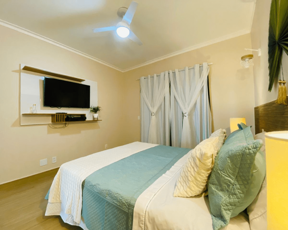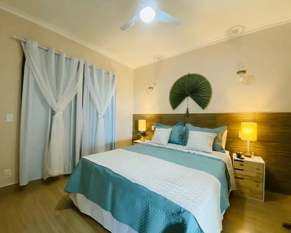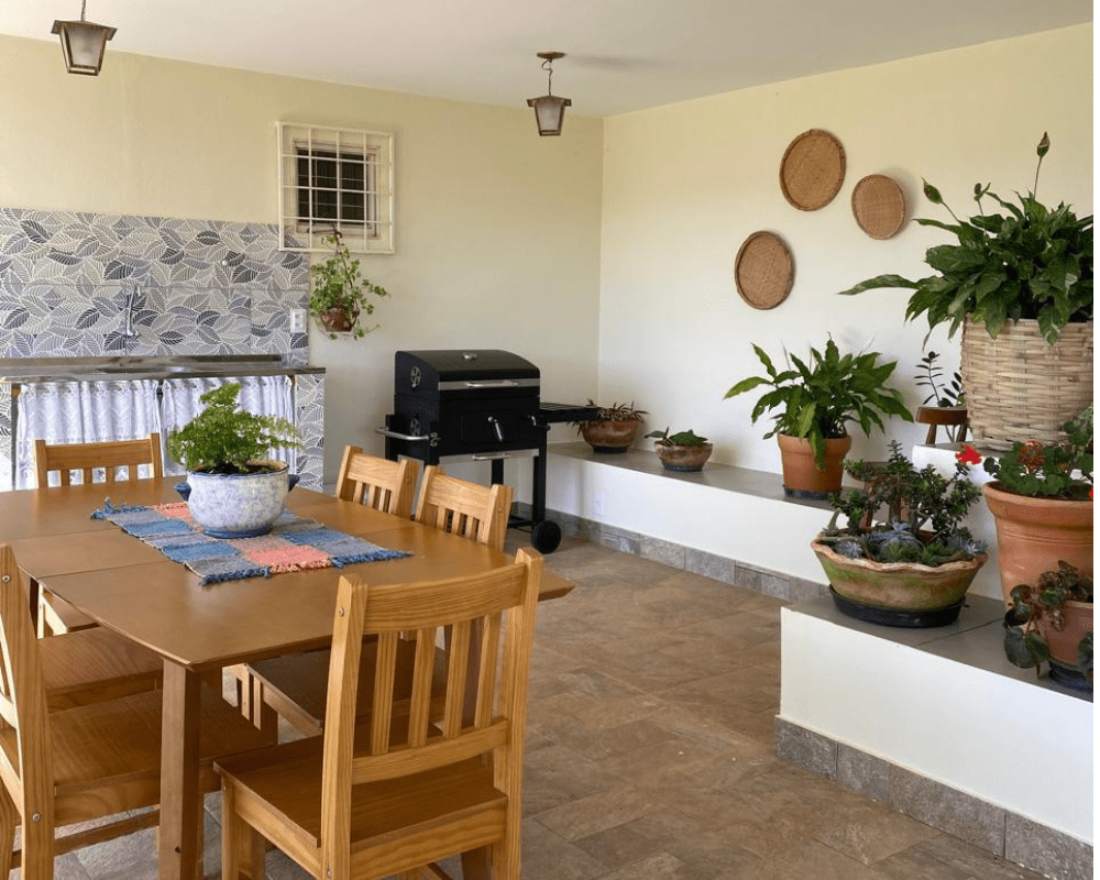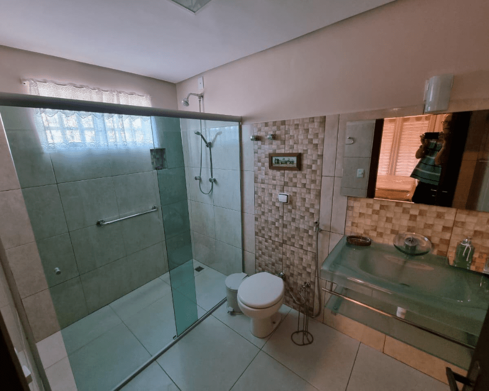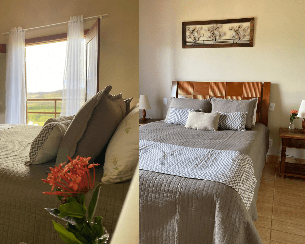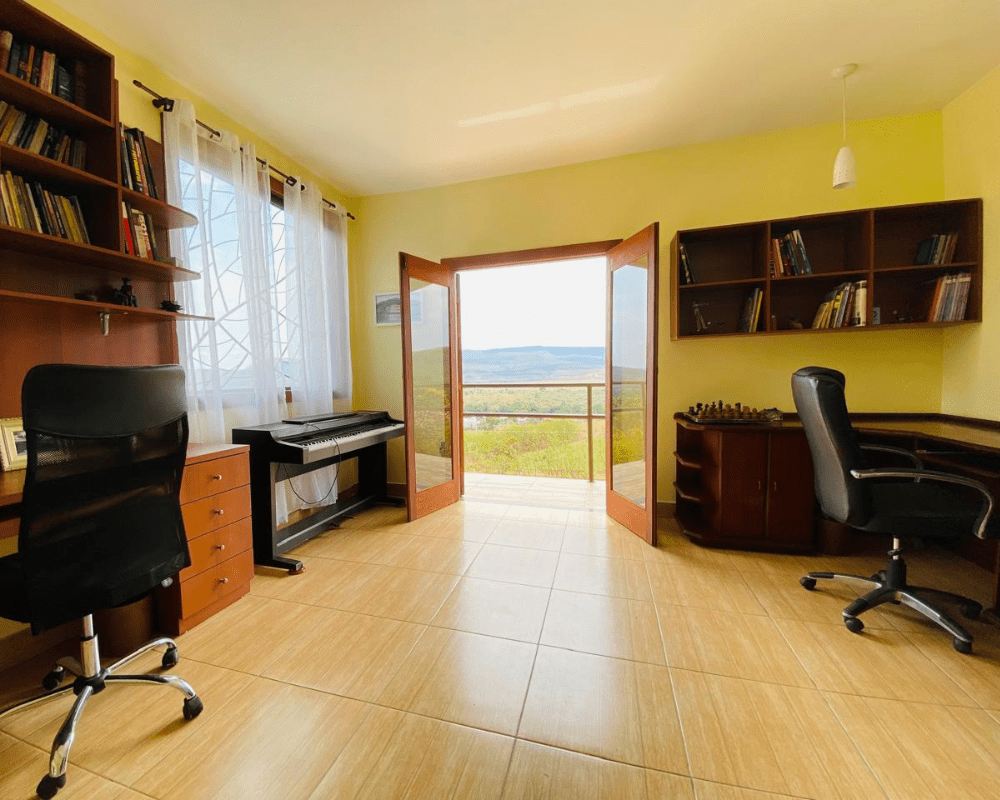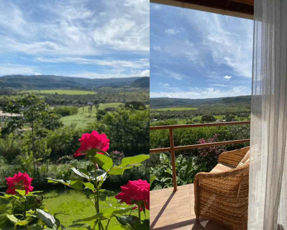 São 400m² de construção em alvenaria em ótimo estado de conservação e fino acabamento, projetada pela renomada arquiteta Edna Leone, com vista permanente para o vale e serras construída em terreno de 1.100m² com suave relevo que recebe todos os dias revoadas de araras, tucanos e pássaros. Sala de estar com pé direito alto, lareira e parede revestidos em pedra. Escritório com duas estações de trabalho. Varandas em 3 suítes, no escritório e sala jantar. Sala de jantar, 4 amplas suítes com duchas de aquecimento solar. Cozinha completa, varanda, suítes e salas para nascente. Garagem coberta para 2 carros, Dois depósitos. Banheiro e ducha para área de repouso, área de serviço, dependência completa e aquecimento central. Sistema de segurança com câmeras integradas na Internet. Toda mobiliada com jardim, cercada em tela em condomínio com escritura coletiva e registro de matrícula.